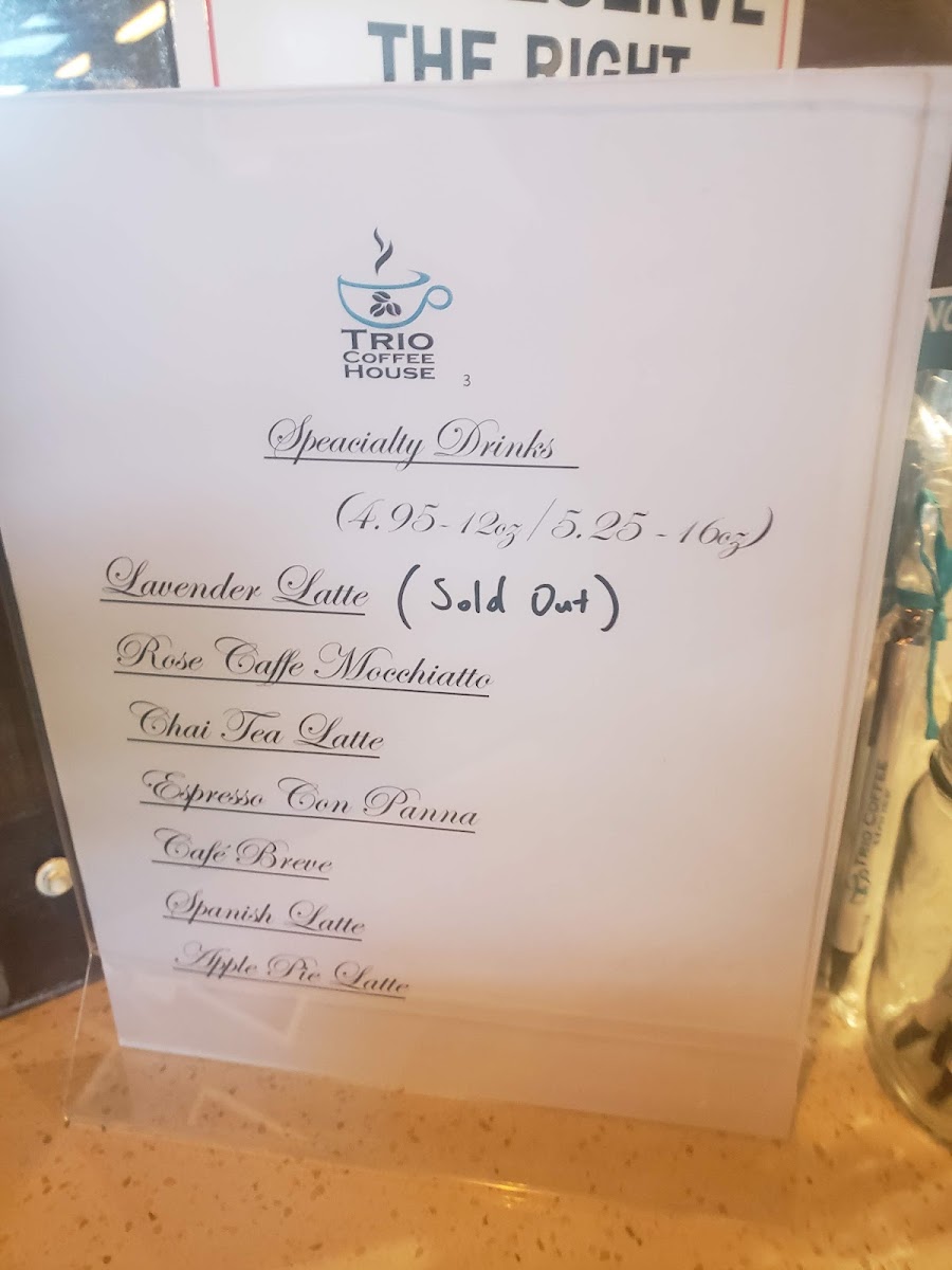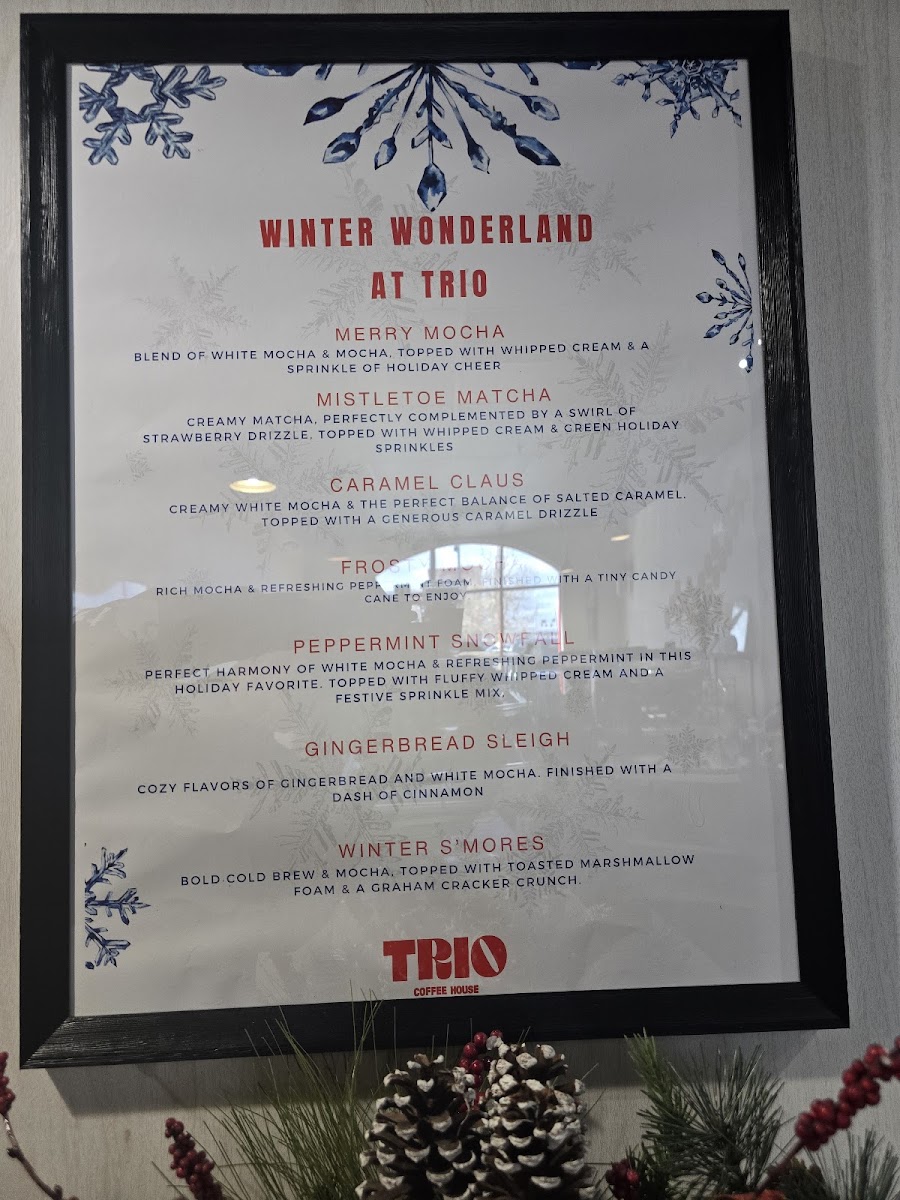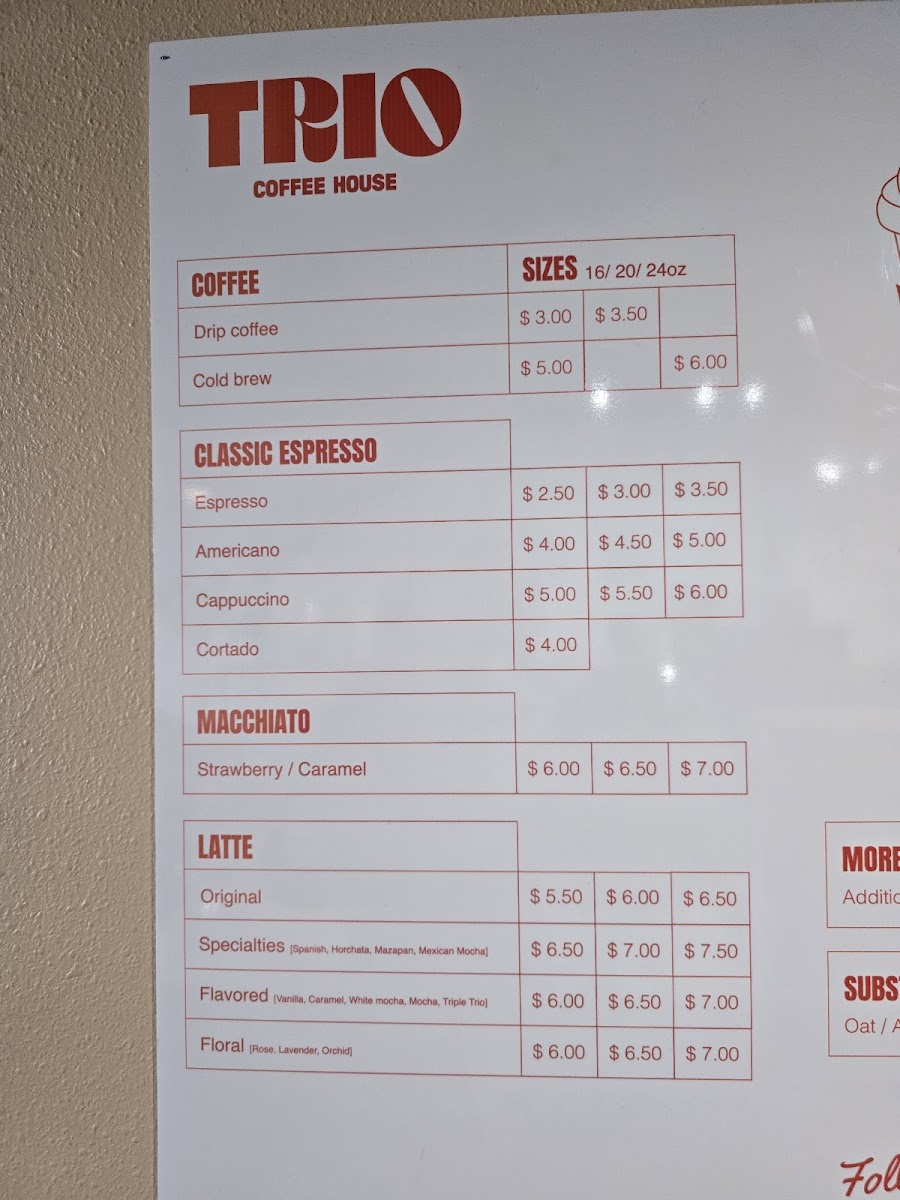 Trio Coffee House in Palmdale offers a straightforward and inviting menu that pairs well with its cozy café setting. The menu centers around comforting coffee drinks crafted with care, alongside a selection of casual bites perfect for any time of the day.